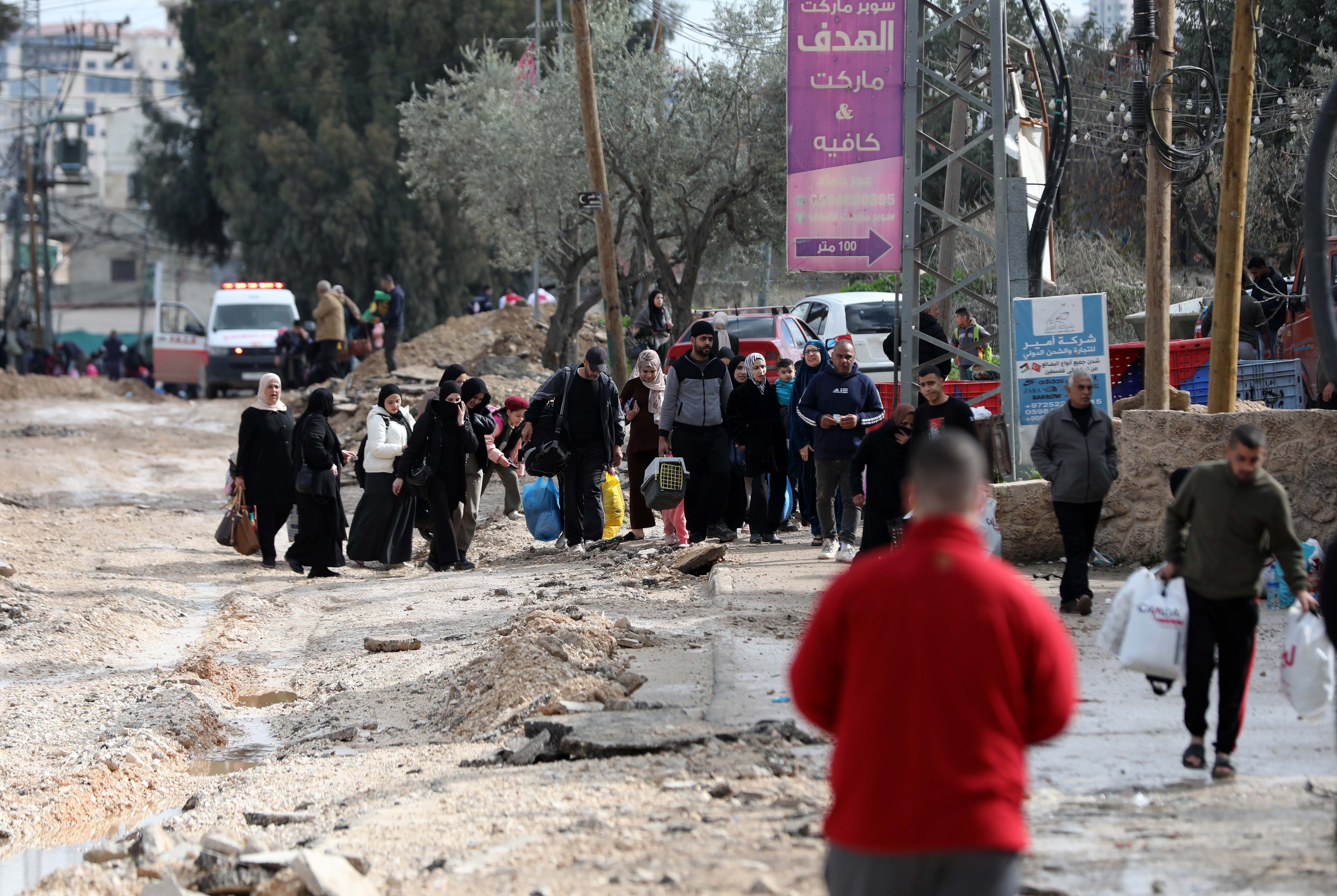 1月23日,受以军军事行动影响无家可归的巴勒斯坦人走在约旦河西岸城市杰宁街头。新华社发(尼达尔·艾仕塔耶摄)据《以色列时报》2月23日报道,以色列国防部长卡茨表示,他已指示以军至少在未来一年内驻扎在约旦河西岸多个难民营,不允许约4万名流离失所的巴勒斯坦人返回。